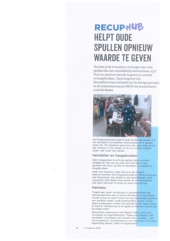 De RecupHub is in 2019 gestart. Via workshops in de Kringloopwinkels van Zuid-West-Vlaanderen kunnen mensen hun tweedehands-en afgedankte goederen nieuw leven inblazen, dit in samenwerking met externe partners zoals Colora en Mic Mac Miniscule. Zo werden ondermeer meubels en bloempotten gepimpt en geschilderd en babyspulletjes gemaakt.